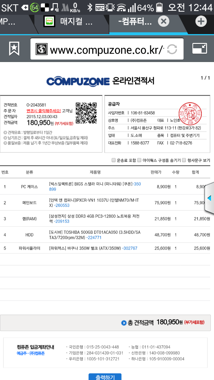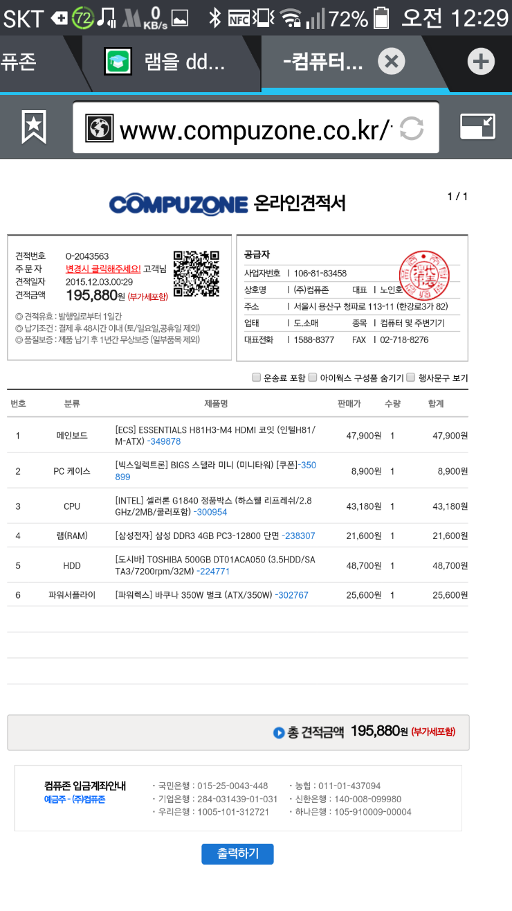 일단 들어가기 이전에 이 견적표는 조립비(2만원)+택배비(2천5백원) 제외된 가격이며 운영체제도 당연히 없습니다. 직접 따로 구해서 설치해야합니다. :)