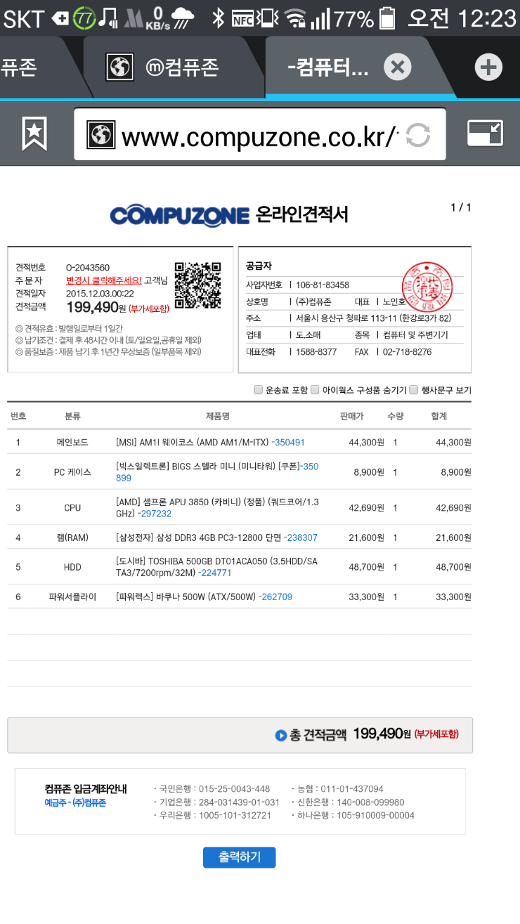참고로 가격은 199,490원입니다만 이 견적은 파워을 500w을 사용했는데 상위견적표의 파워(300w)을 사용해도 됩니다. 그렇게 하면 가격은 191,790원이 되겠죠.
